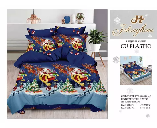 Lenjerie de Pat, Bumbac 100% Finet, 6 piese cu elastic Mos Craciun-