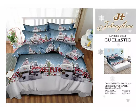 Lenjerie de Pat, Bumbac 100% Finet, 6 piese cu elastic Mos Craciun-