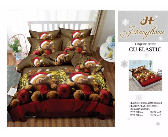 Lenjerie de Pat, Bumbac 100% Finet, 6 piese cu elastic Mos Craciun-