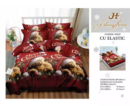Lenjerie de Pat, Bumbac 100% Finet, 6 piese cu elastic Mos Craciun-