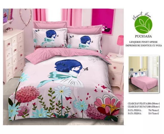 Lenjerie de Pat pentru 2 persoane cu 6 piese confectionata din Bumbac Finet 3D.