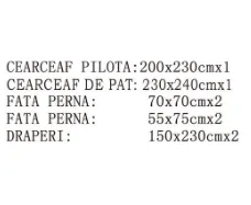 - Dimensiune cearceaf pat: 230cm x 240cm.
