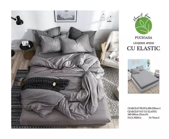 Pachetul contine: - cearsaf pilota: 200x230 cm - cearsaf pat cu elastic: 180x200cm - 2xfata de perna: 50x70cm - 2 fata de perna: 70x70cm