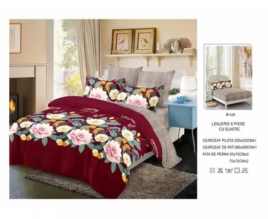 Pachetul contine: - cearsaf pilota: 200x230 cm - cearsaf pat cu elastic: 180x200cm - 2xfata de perna: 50x70cm - 2 fata de perna: 70x70cm