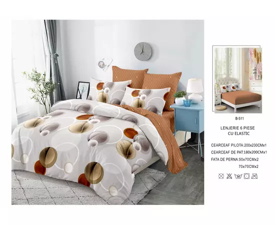 Pachetul contine: - cearsaf pilota: 200x230 cm - cearsaf pat cu elastic: 180x200cm - 2xfata de perna: 50x70cm - 2 fata de perna: 70x70cm