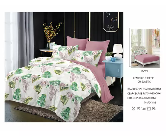 Pachetul contine: - cearsaf pilota: 200x230 cm - cearsaf pat cu elastic: 180x200cm - 2xfata de perna: 50x70cm - 2 fata de perna: 70x70cm
