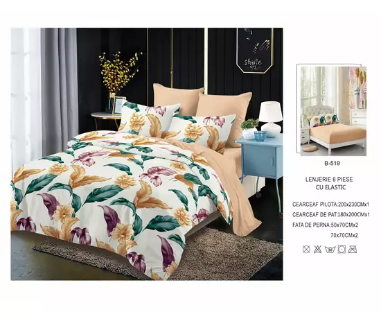 Pachetul contine: - cearsaf pilota: 200x230 cm - cearsaf pat cu elastic: 180x200cm - 2xfata de perna: 50x70cm - 2 fata de perna: 70x70cm