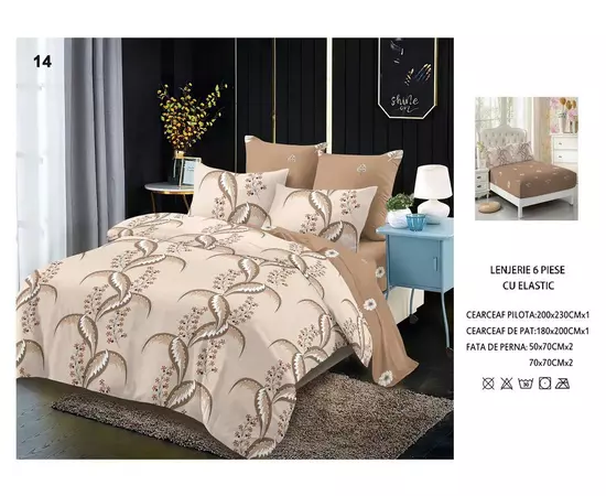 Pachetul contine: - cearsaf pilota: 200x230 cm - cearsaf pat cu elastic: 180x200cm - 2xfata de perna: 50x70cm - 2 fata de perna: 70x70cm