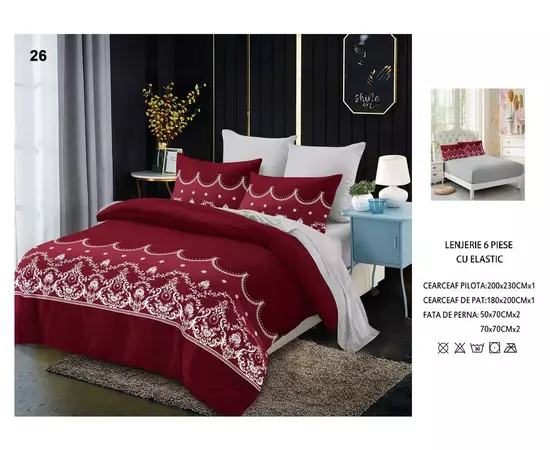 Pachetul contine: - cearsaf pilota: 200x230 cm - cearsaf pat cu elastic: 180x200cm - 2xfata de perna: 50x70cm - 2 fata de perna: 70x70cm
