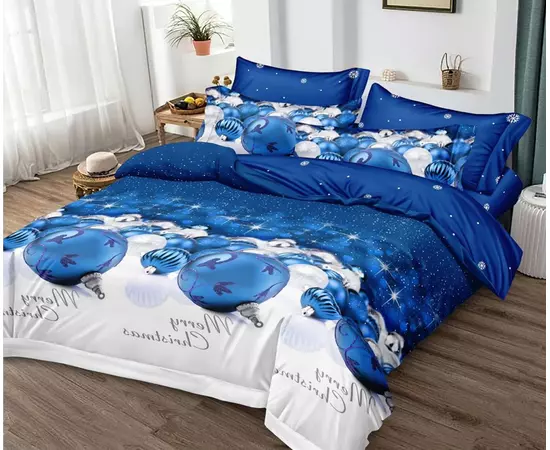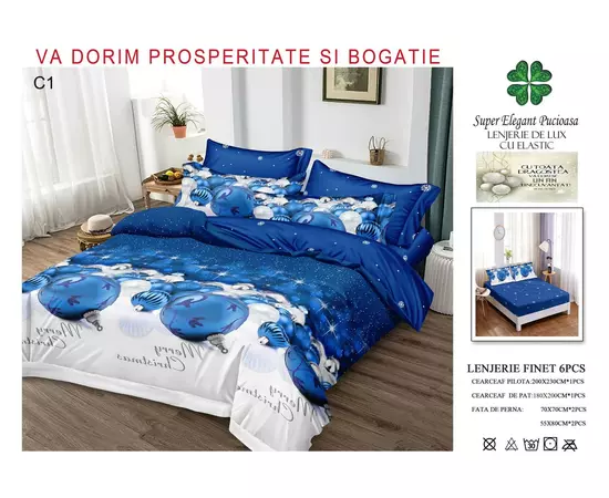 Lenjerie de Pat Bumbac Finet 6 Piese cu Elastic, Model de Craciun - PUC195