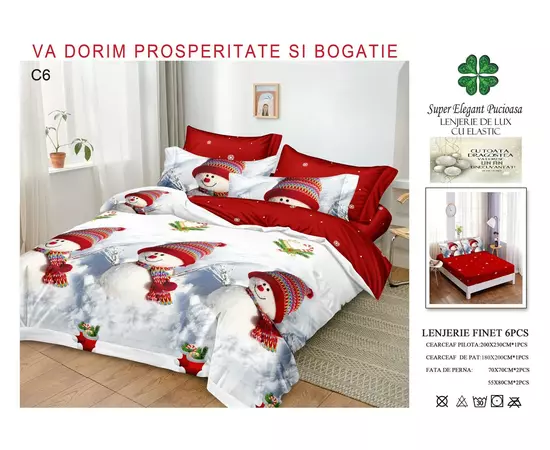 Lenjerie de Pat Bumbac Finet 6 Piese cu Elastic, Model de Craciun - PUC197