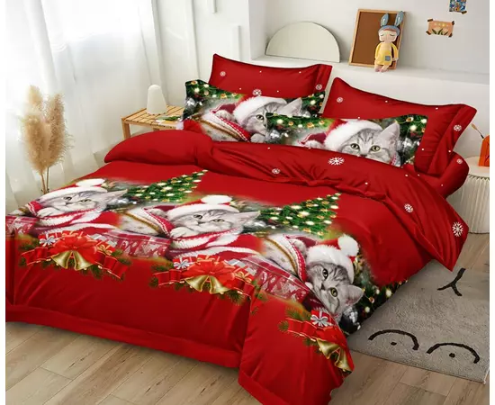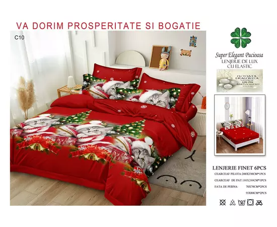 Lenjerie de Pat Bumbac Finet 6 Piese cu Elastic, Model de Craciun - PUC201