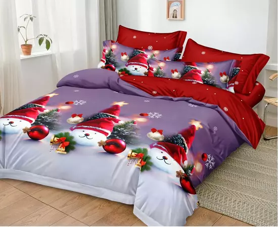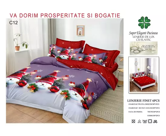 Lenjerie de Pat Bumbac Finet 6 Piese cu Elastic, Model de Craciun - PUC203