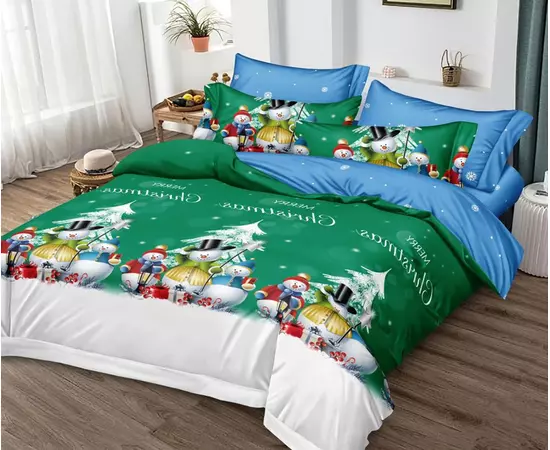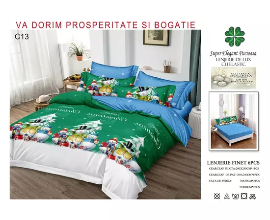 Lenjerie de Pat Bumbac Finet 6 Piese cu Elastic, Model de Craciun - PUC208