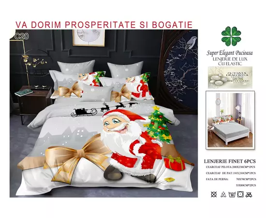 Lenjerie de Pat Bumbac Finet 6 Piese cu Elastic, Model de Craciun - PUC209