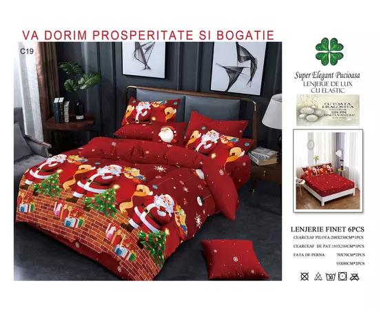 Lenjerie de Pat Bumbac Finet 6 Piese cu Elastic, Model de Craciun - PUC210
