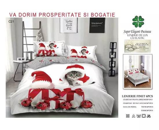 Lenjerie de Pat Bumbac Finet 6 Piese cu Elastic, Model de Craciun - PUC211