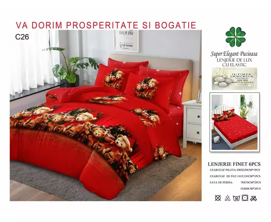 Lenjerie de Pat Bumbac Finet 6 Piese cu Elastic, Model de Craciun - PUC212