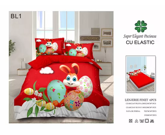 Lenjerie de pat Bumbac Finet, 6 Piese cu Elastic, Model de Paste - PUC236