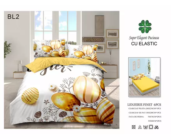 Lenjerie de pat Bumbac Finet, 6 Piese cu Elastic, Model de Paste - PUC239