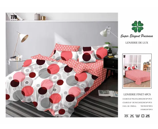 - cearceaf pentru pat cu elastic 180x200cm - cearceaf pentru pilota 200x230cm - 2 bucati fete de perne 50x75cm + 2 bucati fete de perne 70x70cm