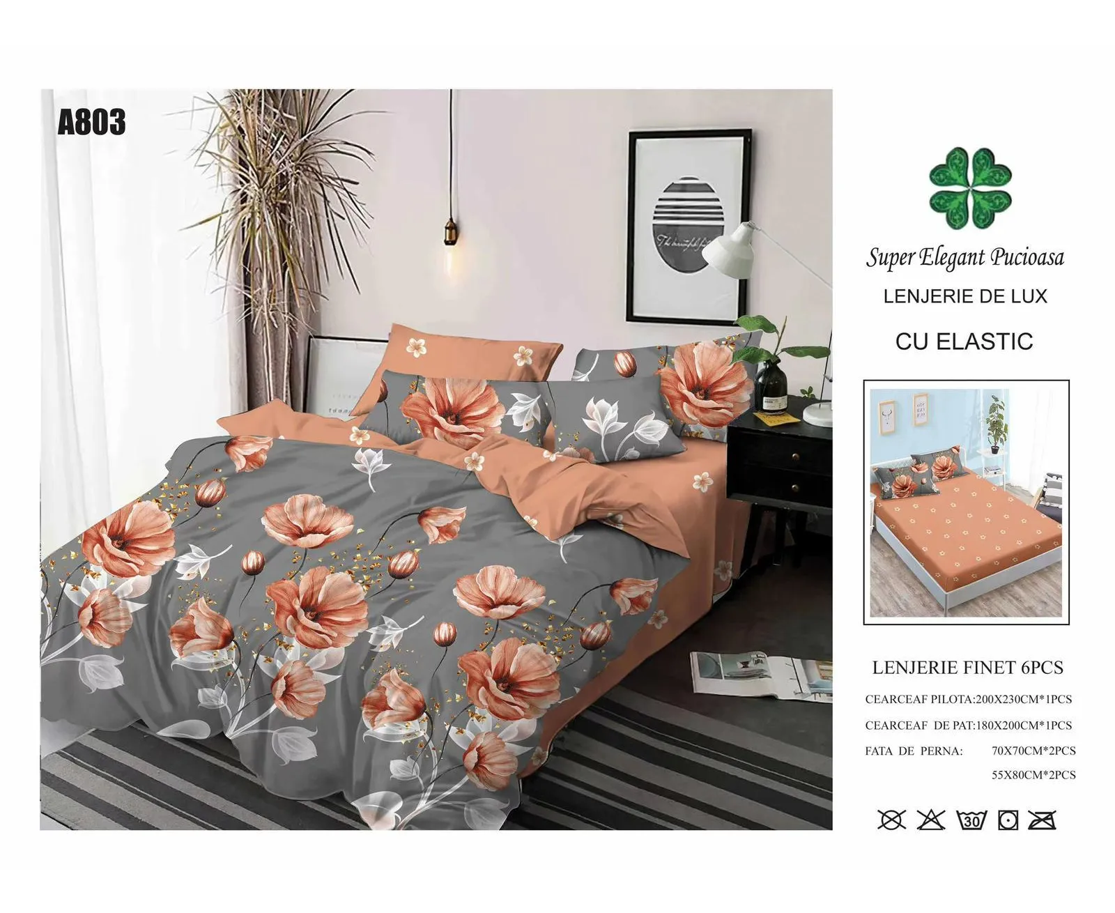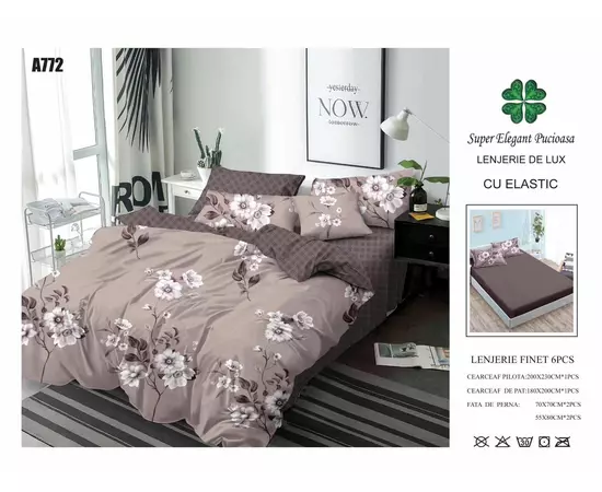 - cearceaf pentru pat cu elastic 180x200cm - cearceaf pentru pilota 200x230cm - 2 bucati fete de perne 50x75cm + 2 bucati fete de perne 70x70cm
