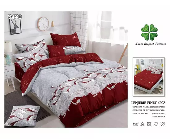 - cearceaf pentru pat cu elastic 180x200cm - cearceaf pentru pilota 200x230cm - 2 bucati fete de perne 50x75cm + 2 bucati fete de perne 70x70cm