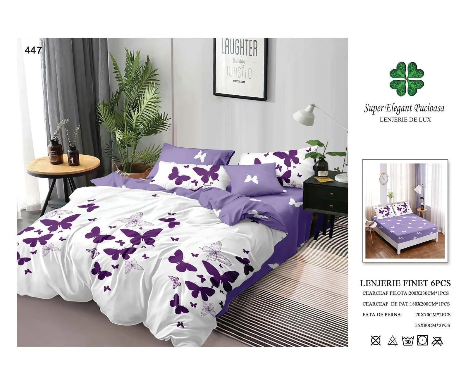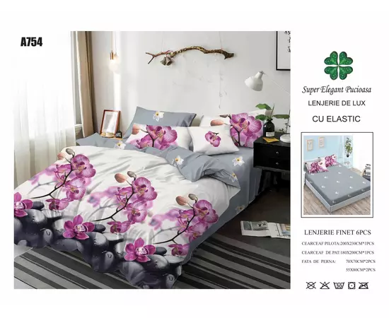 - cearceaf pentru pat cu elastic 180x200cm - cearceaf pentru pilota 200x230cm - 2 bucati fete de perne 50x75cm + 2 bucati fete de perne 70x70cm