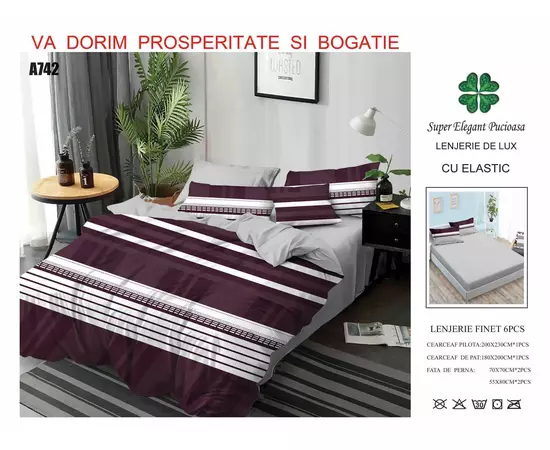 - cearceaf pentru pat cu elastic 180x200cm - cearceaf pentru pilota 200x230cm - 2 bucati fete de perne 50x75cm + 2 bucati fete de perne 70x70cm