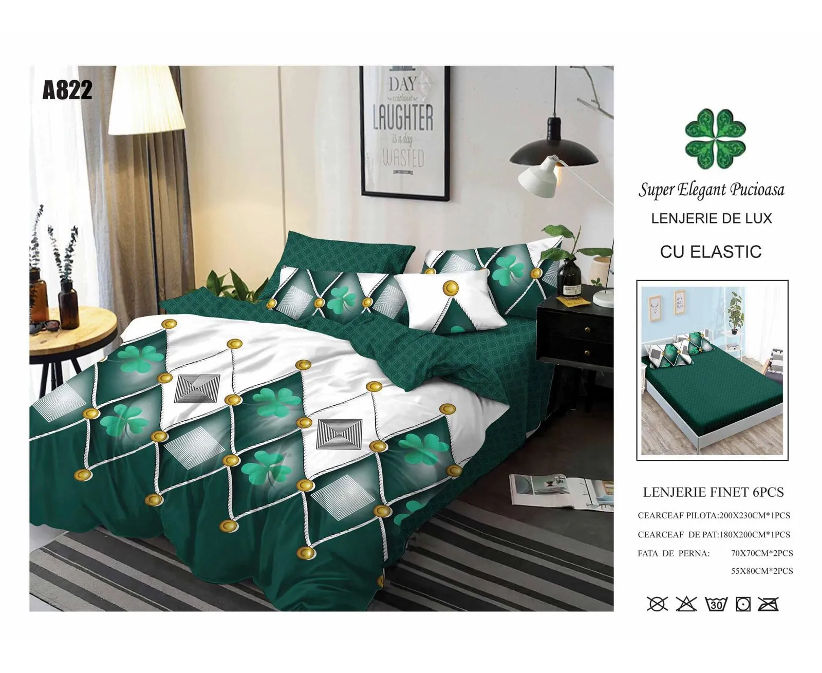 - cearceaf pentru pat cu elastic 180x200cm - cearceaf pentru pilota 200x230cm - 2 bucati fete de perne 50x75cm + 2 bucati fete de perne 70x70cm
