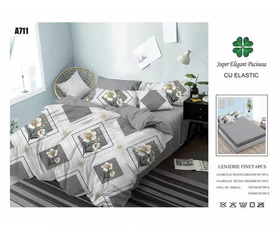 - cearceaf pentru pat cu elastic 180x200cm - cearceaf pentru pilota 200x230cm - 2 bucati fete de perne 50x75cm + 2 bucati fete de perne 70x70cm
