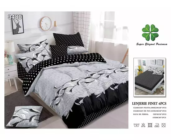 - cearceaf pentru pat cu elastic 180x200cm - cearceaf pentru pilota 200x230cm - 2 bucati fete de perne 50x75cm + 2 bucati fete de perne 70x70cm