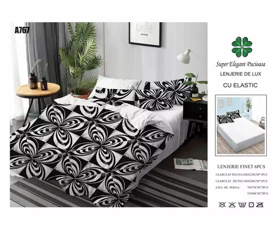 - cearceaf pentru pat cu elastic 180x200cm - cearceaf pentru pilota 200x230cm - 2 bucati fete de perne 50x75cm + 2 bucati fete de perne 70x70cm