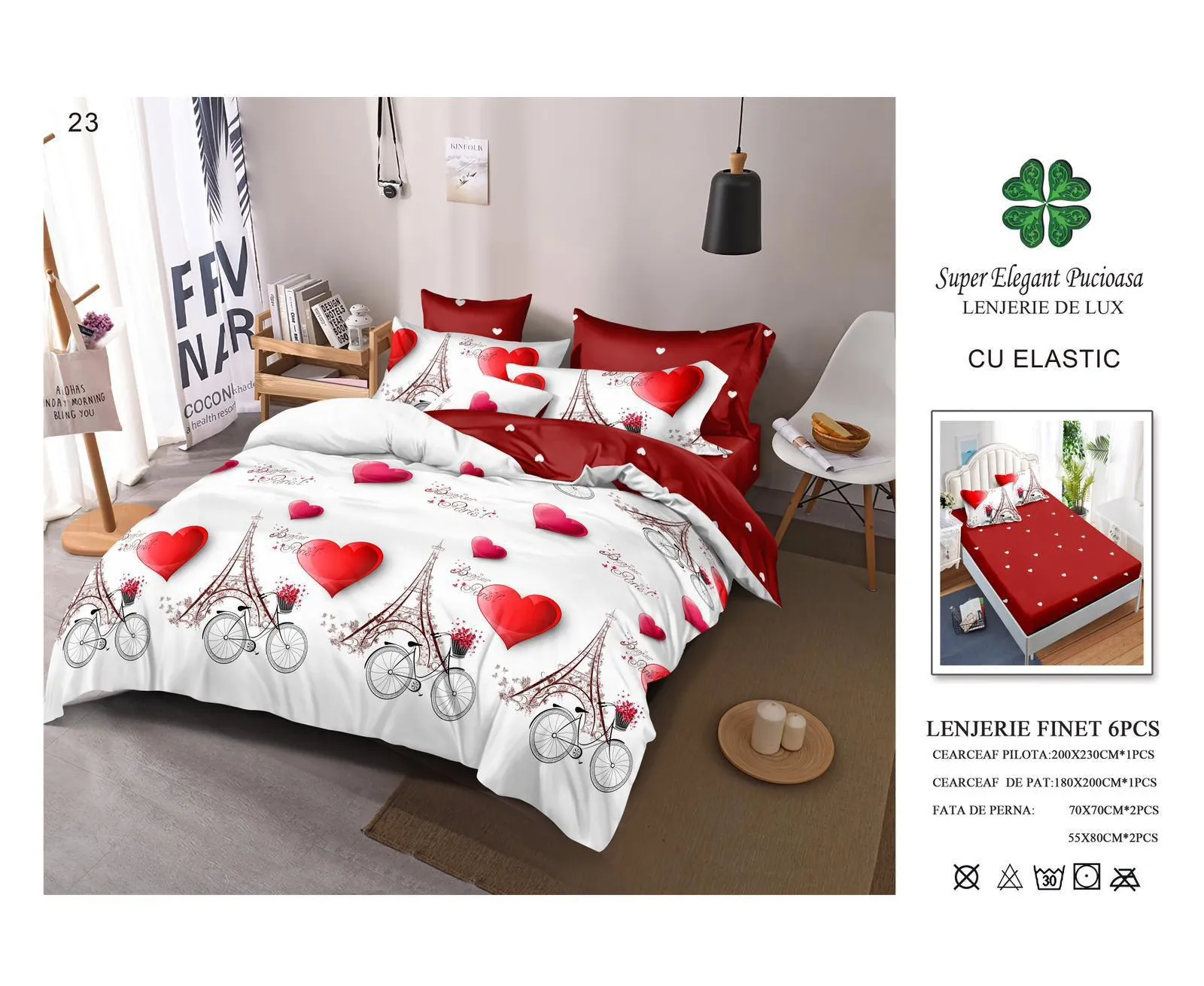- cearceaf pentru pat cu elastic 180x200cm - cearceaf pentru pilota 200x230cm - 2 bucati fete de perne 50x75cm + 2 bucati fete de perne 70x70cm