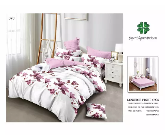 - cearceaf pentru pat cu elastic 180x200cm - cearceaf pentru pilota 200x230cm - 2 bucati fete de perne 50x75cm + 2 bucati fete de perne 70x70cm