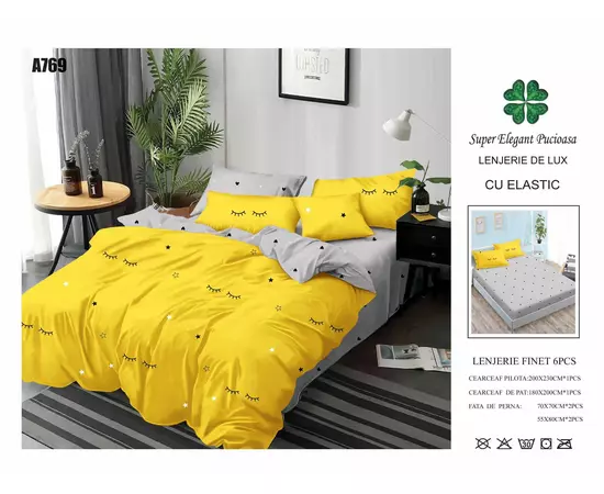- cearceaf pentru pat cu elastic 180x200cm - cearceaf pentru pilota 200x230cm - 2 bucati fete de perne 50x75cm + 2 bucati fete de perne 70x70cm