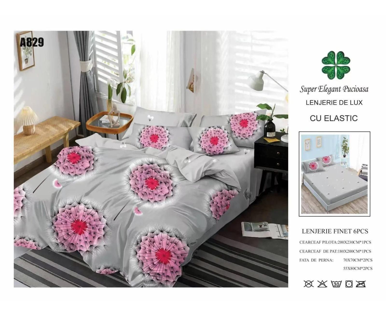 - cearceaf pentru pat cu elastic 180x200cm - cearceaf pentru pilota 200x230cm - 2 bucati fete de perne 50x75cm + 2 bucati fete de perne 70x70cm