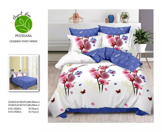Lenjerie de Pat pentru 2 persoane cu 6 piese confectionata din Bumbac Finet.