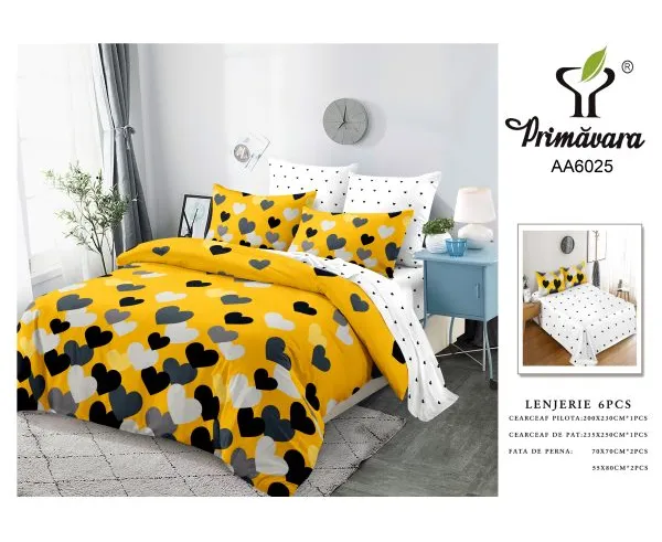 Lenjerie de Pat pentru 2 persoane cu 6 piese confectionata din Bumbac Finet.