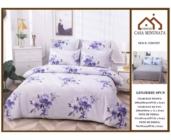 Lenjerie de Pat pentru 2 persoane cu 6 piese confectionata din Bumbac Finet.