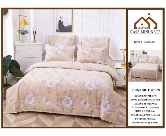 Lenjerie de Pat pentru 2 persoane cu 6 piese confectionata din Bumbac Finet.