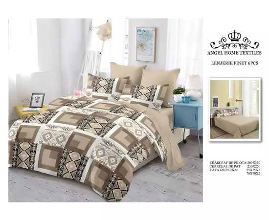 Lenjerie de Pat pentru 2 persoane cu 6 piese, confectionata din Bumbac Finet.