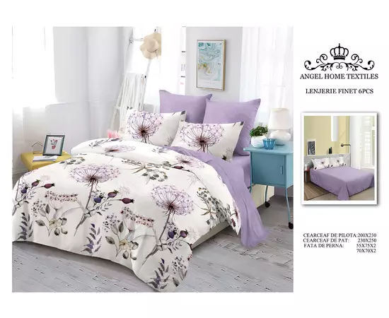 Lenjerie de Pat pentru 2 persoane cu 6 piese, confectionata din Bumbac Finet.