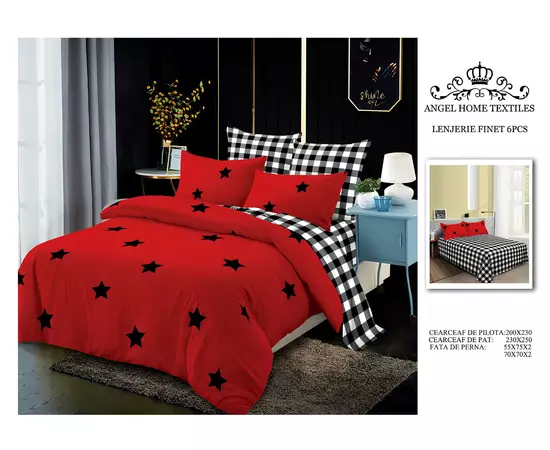 Lenjerie de Pat pentru 2 persoane cu 6 piese, confectionata din Bumbac Finet.