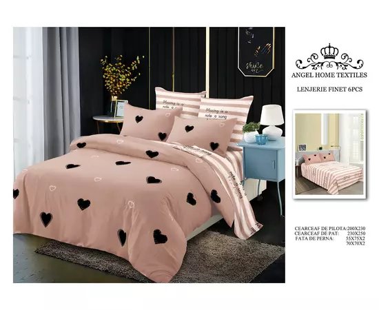 Lenjerie de Pat pentru 2 persoane cu 6 piese, confectionata din Bumbac Finet.