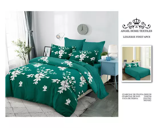 Lenjerie de Pat pentru 2 persoane cu 6 piese, confectionata din Bumbac Finet.