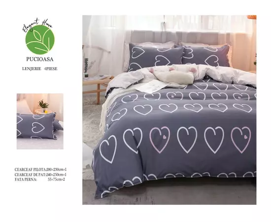 Materialul din care este confectionată lenjeria este bumbac de calitate superioara cu o textura fina, moale si foarte placuta la atingere.