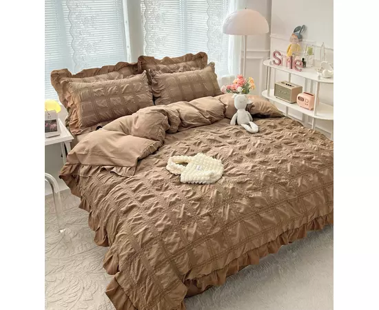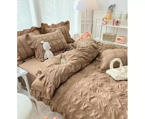 Lenjerie de Pat Dublu, Bumbac Finet-Creponat, 6 Piese, Bej - JO253