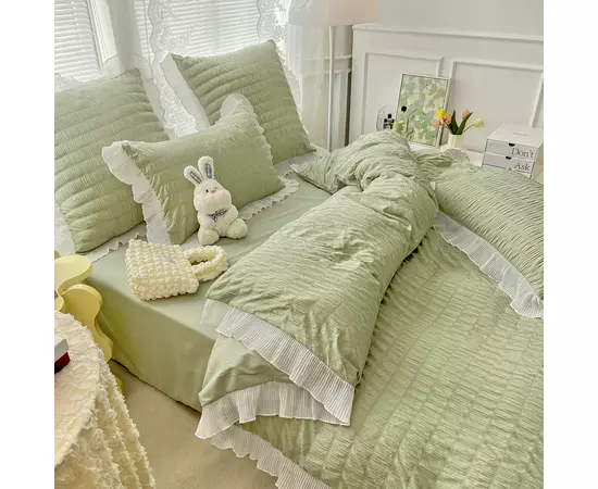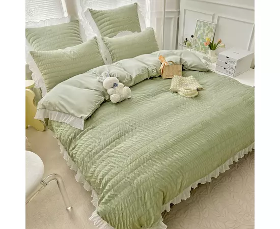 Lenjerie de Pat Dublu, Bumbac Finet-Creponat cu Margine, 6 Piese, Verde- JO311