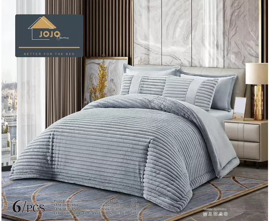 Setul este compus din 6 piese esențiale pentru a îmbrăca patul într-un mod complet: o pilotă moale și călduroasă, un cearceaf cu elastic pentru o potrivire perfectă pe salteaua ta, două fețe de pernă și două perne mari. Fiecare element este gândit pentru a aduce o senzație de rafinament și bun-gust în dormitorul tău.